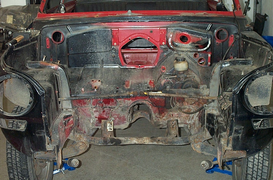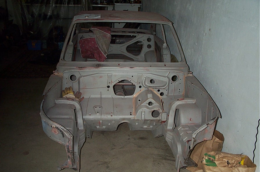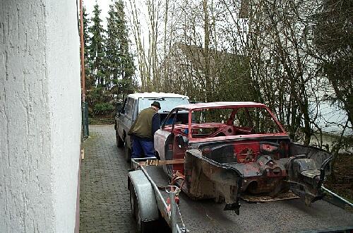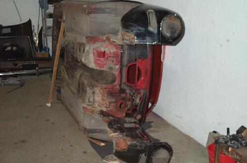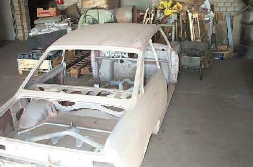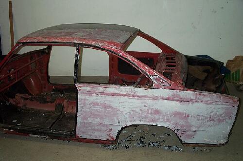 Nach dem raustrennen der offensichtlich nicht mehr zu rettenden Blechteile wie z.b. Endspitzen rechts und links die beiden vorderen Kotflügel kommt die Rohkarosse das erste mal zum Sandstrahlen. Das Gewicht hat sich derart reduziert das zum tragen der Karosse zwei Personen ausreichend sind.