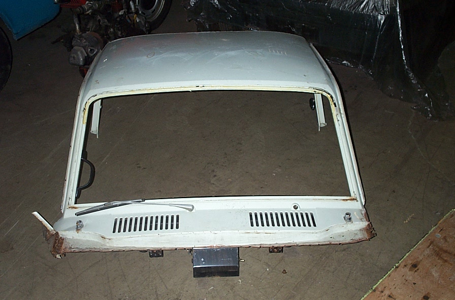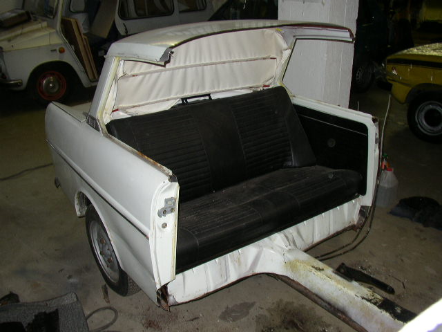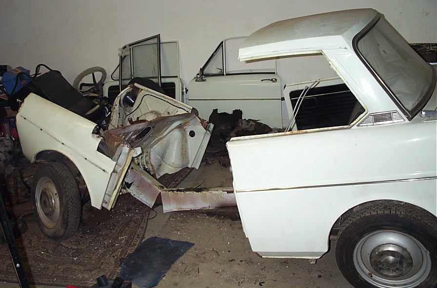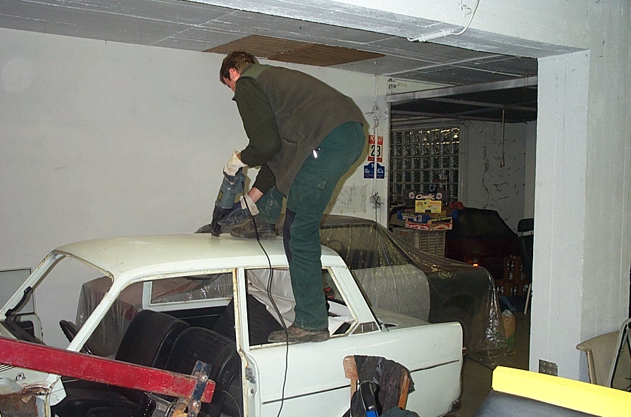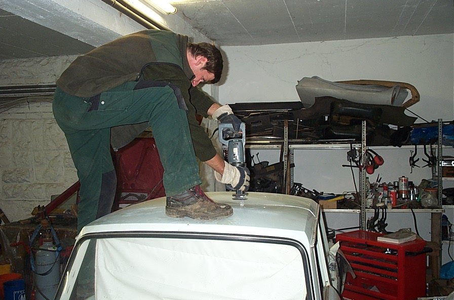 aber nichts im vergleich zu dem Ordentlichem Frontschaden vor dem auflaufen auf die Anhängerdeichsel. Eben der Ideale Teileträger ,als erstes brauche ich Dach und Scheibenrahmen A und B-Säulen und das Dach was dahinter kommt braucht der Kombi nicht und wird weggeschnitten. Nach dem herausschneiden der Bodengruppe samt Schwellern wirkt der Kardantunnel wie die Deichsel einer Fahrradrikscha. Erst nach dem anschneiden des Kardantunnels ist die Karosse nicht mehr fähig auf eigenen Rädern zu stehen. |